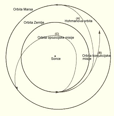 Zemlje na Mars po eliptični poti. Ta se tangencialno dotika Zemljine